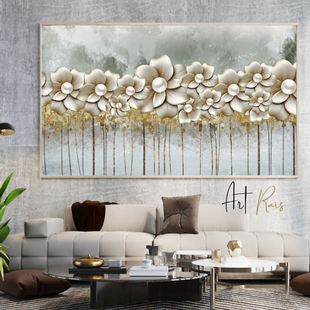 Ce tableau en format paysage capture la délicatesse de fleurs aux pétales ivoire, disposées en une frise luxuriante et aérienne. Émergeant d’un fond vaporeux aux nuances de gris et bleu pâle, ces fleurs semblent flotter au-dessus d’un sous-bois stylisé fait de tiges dorées élancées. Le contraste entre la finesse florale et la texture scintillante évoque un jardin suspendu entre rêve et réalité. Parfait pour un intérieur raffiné, cette œuvre incarne une esthétique douce, minimaliste et résolument élégante.