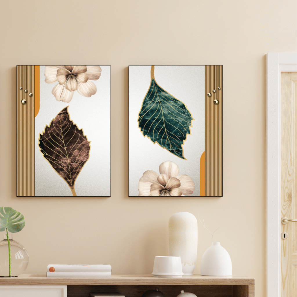 Élégance Botanique est une composition délicate où la nature s’exprime avec raffinement. Deux panneaux jumelés présentent des feuilles aux nervures dorées sur un fond texturé crème, rehaussées par des fleurs douces aux pétales ivoire. L’or fin et les motifs linéaires latéraux ajoutent une touche de luxe moderne à cette scène végétale minimaliste. L’œuvre joue avec les contrastes entre matière organique et design géométrique, créant une ambiance à la fois naturelle et sophistiquée. Un choix parfait pour les intérieurs épurés en quête de poésie visuelle.