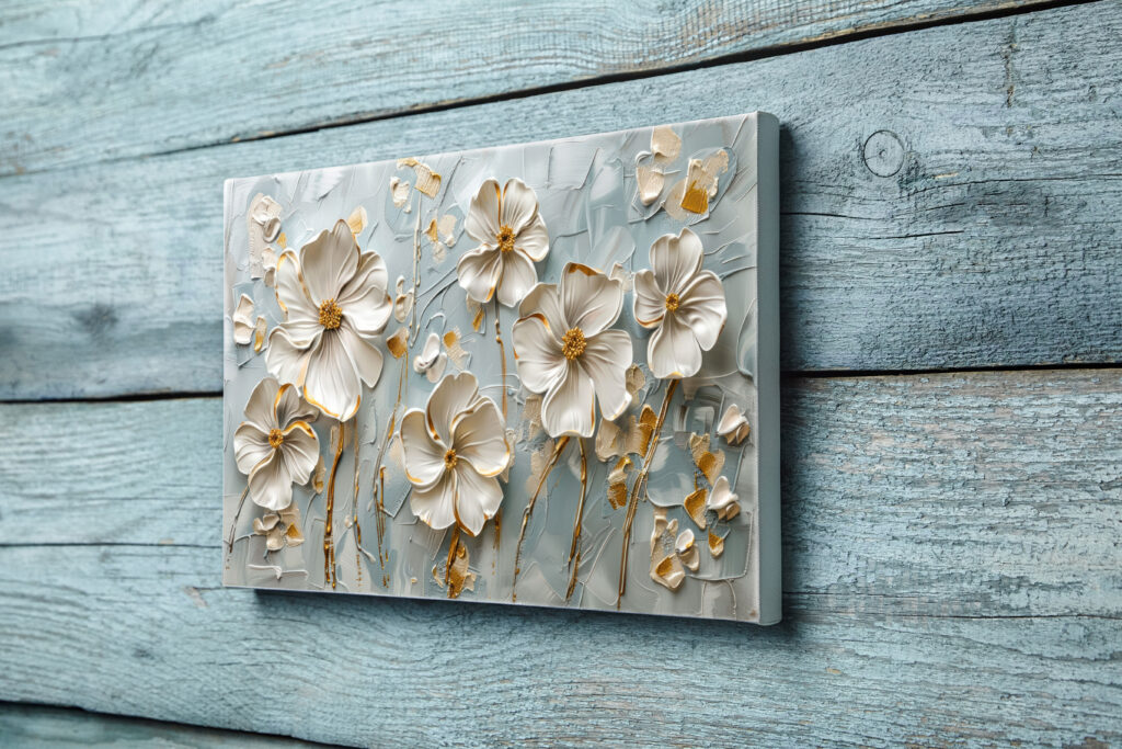 Cette œuvre délicate capture la beauté figée d’un bouquet de fleurs épanouies dans une brise glacée. Sur une toile aux nuances bleutées rappelant le givre ou le bois usé par le temps, les fleurs sculptées en relief se détachent avec éclat. Leurs pétales nacrés, bordés de doré, semblent à la fois fragiles et éternels. L’application texturée et les touches dorées renforcent l’impression d’élégance intemporelle. Fleurs de Givre est une célébration de la nature figée dans sa splendeur, entre éclat et silence.