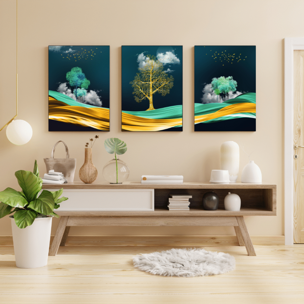 Ce triptyque saisissant nous transporte dans un monde imaginaire où la nature prend des allures de rêve éveillé. Chaque panneau met en valeur un arbre majestueux – tantôt feuillu, tantôt doré – se dressant sur des collines ondulantes aux teintes dorées et turquoise. Les cieux bleu nuit sont animés de nuages flottants et de vols d’oiseaux dorés, ajoutant une touche poétique à l’ensemble. L’effet visuel est renforcé par la fluidité des lignes et l’éclat métallique des couleurs. Forêts Oniriques est une ode à l’imaginaire, un hommage à la beauté surréaliste de la nature sublimée.