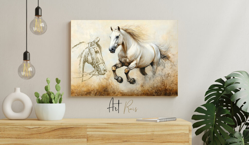 Sublime toile imprimée sur toile de haute qualité, représentant un cheval arabe majestueux dans un style à la fois réaliste et artistique, avec un croquis en arrière-plan qui accentue la beauté de la scène. Disponible en petits, moyens et grands formats, cette œuvre élégante apportera force, mouvement et élégance à votre décoration intérieure.