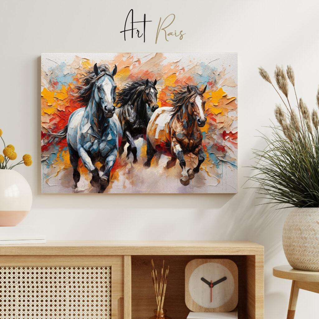 Cette œuvre captivante représente trois chevaux en pleine course, symboles de liberté et de puissance. Les couleurs vives et les coups de pinceau dynamiques créent une scène pleine d’énergie et d’émotion. Parfaite pour ajouter une touche artistique et inspirante à tout espace intérieur.