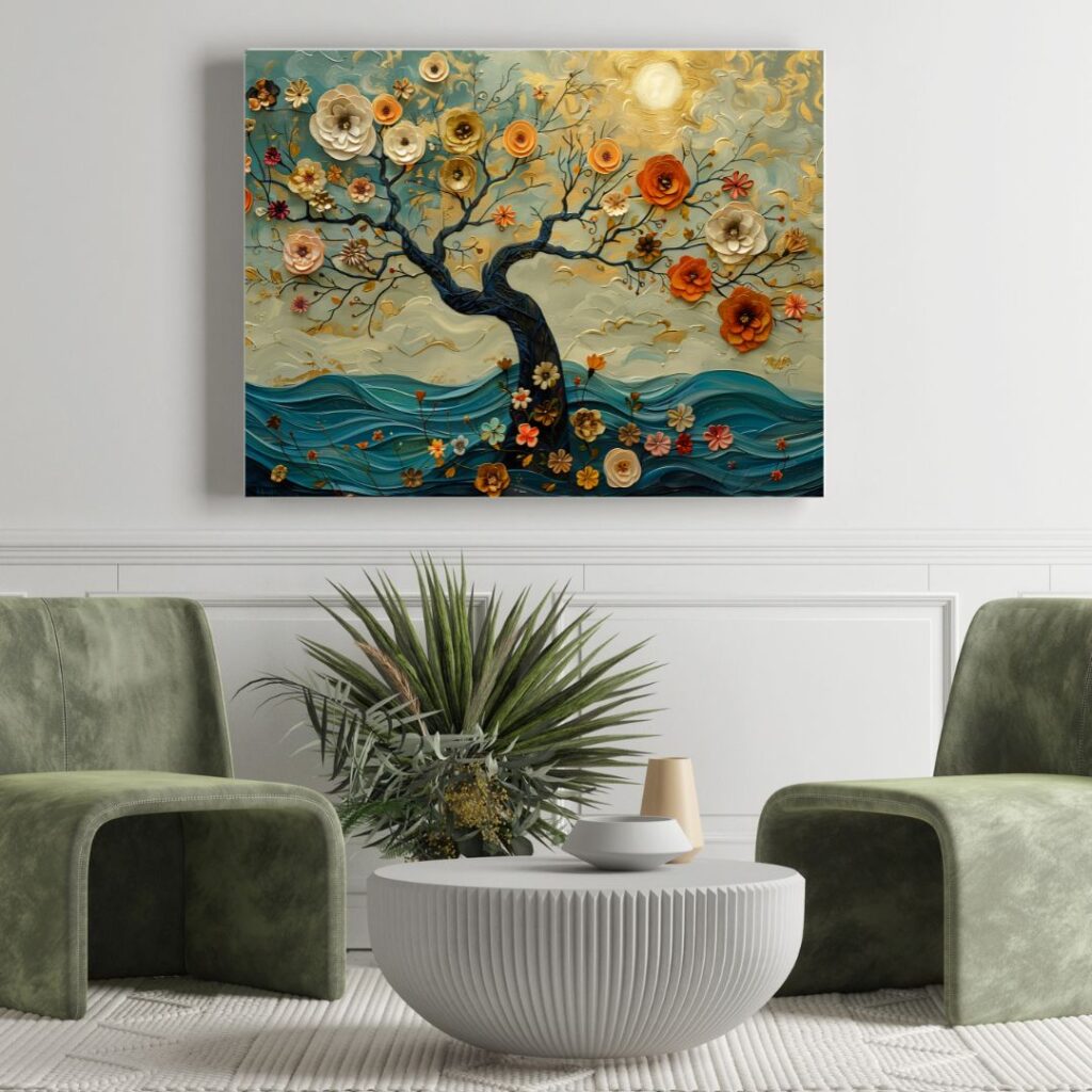 L’Arbre aux Saisons déploie un univers onirique où les éléments naturels semblent danser. L’arbre, au tronc sinueux et enraciné dans une mer stylisée, porte des fleurs de toutes les teintes – du crème délicat à l’orange flamboyant – symbolisant la richesse des saisons. Les vagues ondulées au bas de la composition, les volutes dorées du ciel et le soleil radieux créent une atmosphère féérique. Cette œuvre est une célébration vibrante du cycle de la vie, fusionnant harmonieusement les forces de la nature dans un tableau à la fois apaisant et énergisant.