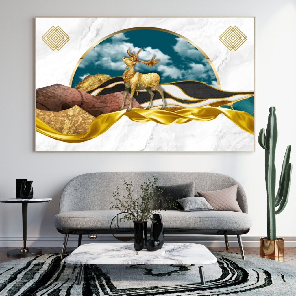 Majestueux et solitaire, un cerf doré se dresse au centre d’un paysage irréel, encadré par un demi-cercle évoquant un soleil stylisé. Le ciel bleu profond parsemé de nuages contraste avec les montagnes abstraites et les plis dorés au premier plan, créant un équilibre entre nature et abstraction. Le fond marbré blanc et les symboles géométriques dorés aux coins renforcent la dimension sacrée et protectrice de la scène. Le Gardien du Soleil évoque la puissance tranquille de la nature, personnifiée par cet animal mythique veillant sur un monde figé dans l’élégance et la lumière.