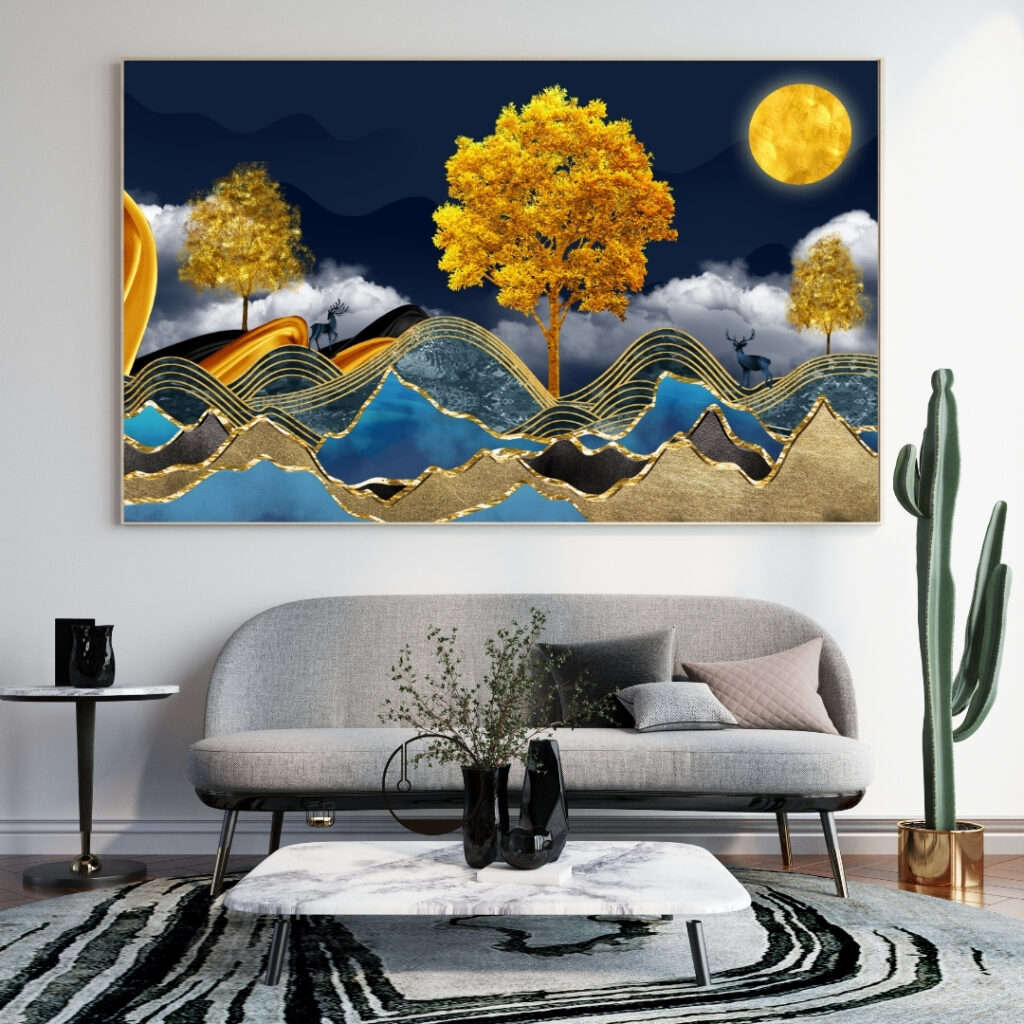 Cette composition contemporaine mêle onirisme et luxe dans une scène fantastique. Des arbres aux feuillages dorés resplendissent sous une lune pleine, également dorée, suspendue dans un ciel d’un bleu nuit profond. Les collines ondulantes, traversées de filets dorés, créent un relief fluide et abstrait où se mêlent textures marbrées, aplats de bleu et touches métalliques. Un cerf bleu nuit apparaît à l’arrière-plan, symbole de grâce et de mystère. Le Règne de l’Or sous la Lune invite à la contemplation d’un monde irréel, où la nature semble précieuse, presque sacrée, capturée entre rêve et matière.
