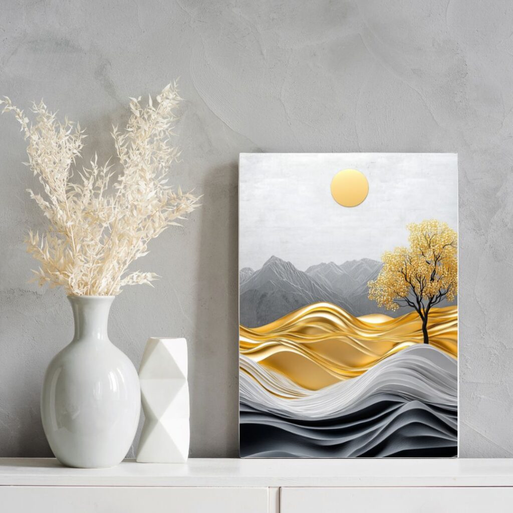 Cette composition poétique nous transporte dans un paysage surréaliste où les vagues dorées et argentées forment un terrain aux allures liquides. À l’arrière-plan, des montagnes grisées surgissent comme un souvenir figé, tandis qu’un arbre doré, solitaire mais majestueux, se dresse sous un soleil circulaire éclatant. L’harmonie entre les teintes métalliques et les éléments naturels évoque le contraste entre matière et mystère, entre force et calme. Lumières de l’Inconnu est une ode contemporaine à la nature sublimée, où chaque élément semble suspendu dans une douce intemporalité.