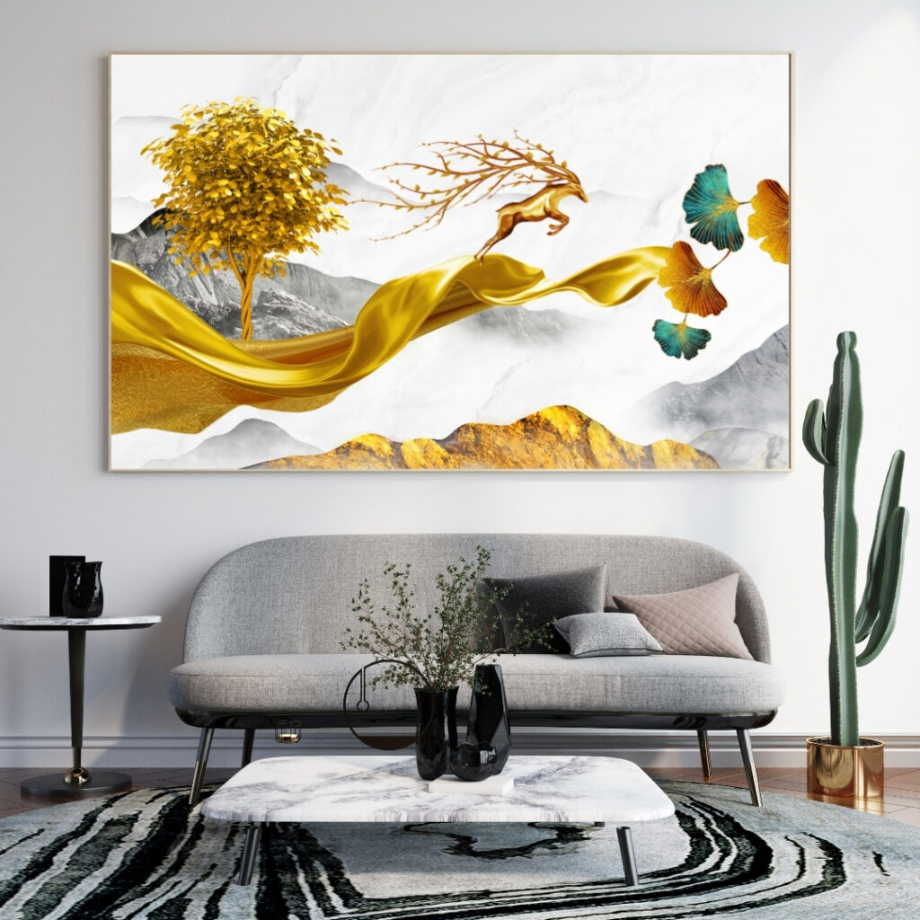 Un cerf élégant bondit à travers un paysage onirique, porté par un drapé doré fluide et entouré d’éléments naturels stylisés. Cette œuvre artistique combine harmonie, mouvement et raffinement, idéale pour sublimer tout intérieur contemporain.
