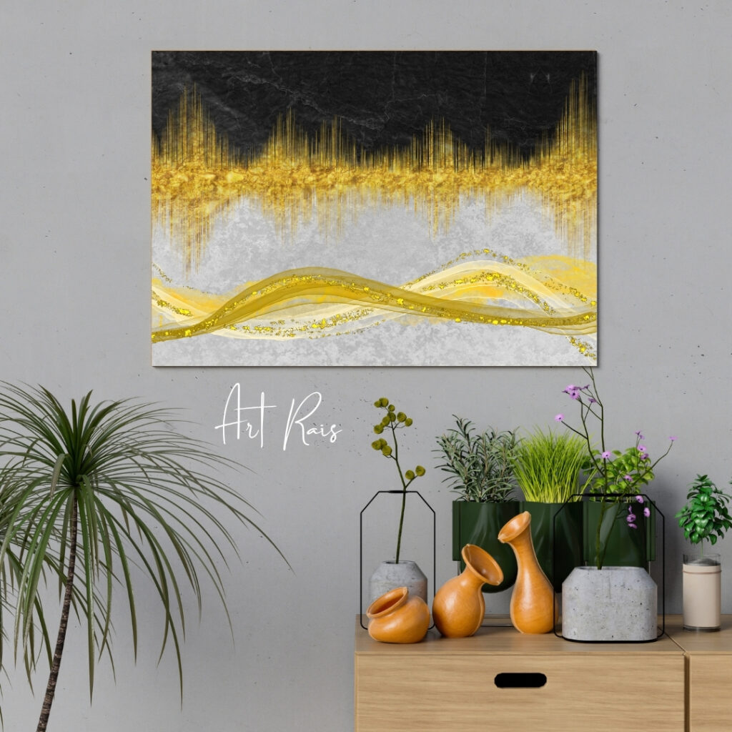 Cette œuvre abstraite vibre d’une énergie lumineuse et raffinée. De riches vagues dorées serpentent horizontalement à travers une texture minérale, évoquant des dunes stylisées ou des flux d’énergie en mouvement. En arrière-plan, un dégradé spectaculaire passe du noir profond au doré scintillant, tel un champ magnétique ou une aurore boréale stylisée. La rencontre entre la matière brute (le marbre gris) et la finesse des reflets dorés crée une harmonie puissante et élégante. Onde Dorée incarne le dynamisme et la richesse, parfait pour évoquer la force subtile du luxe contemporain.