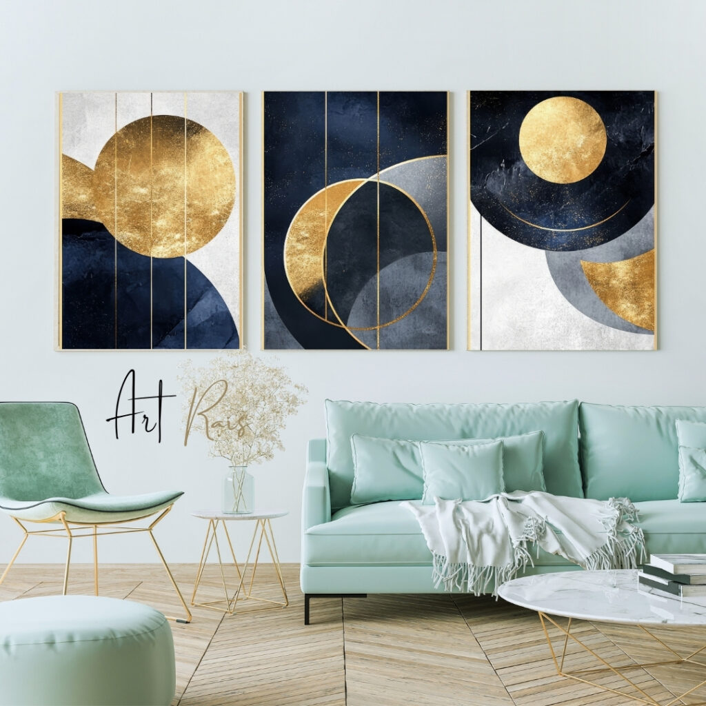 Tableaux Modernes – Art Abstrait Doré et Bleu Nuit (Set de 3)