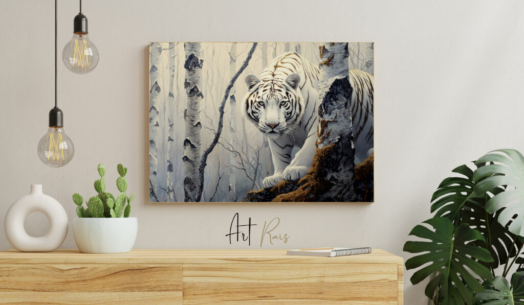 Ajoutez une touche sauvage et élégante à votre intérieur avec ce tableau imprimé sur toile de haute qualité représentant un tigre blanc majestueux dans une forêt mystérieuse.