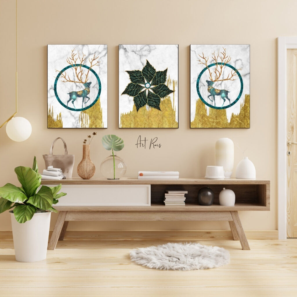 Sublimez votre intérieur avec cet ensemble de tableaux imprimés sur toile de haute qualité. Le design associe des cerfs élégants, une feuille artistique et des touches dorées sur un fond marbré blanc.